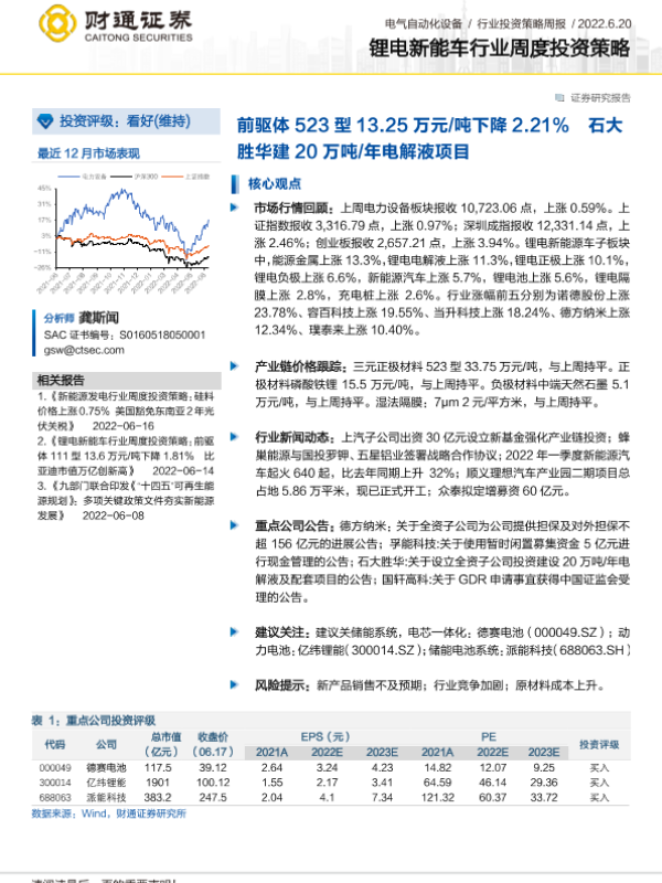 【财通证券】【20220620】锂电新能车行业周度投资策略:前驱体523型13.25万元 吨下降2.21% 石大胜华建20万吨 年电解液项目-20页 行业研究