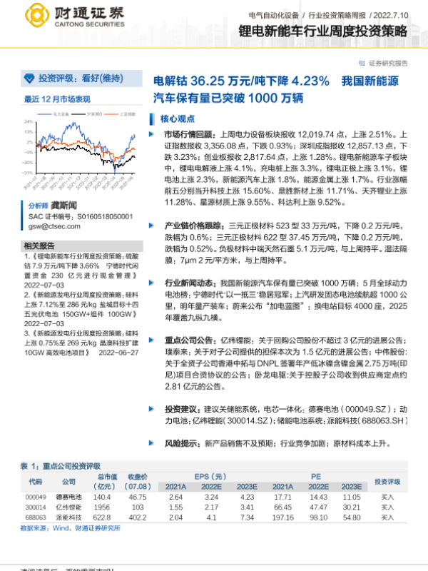【财通证券】【20220710】锂电新能车行业周度投资策略:电解钴36.25万元 吨下降4.23% 国新能源汽车保有量已突破1000万辆-19页 行业研究