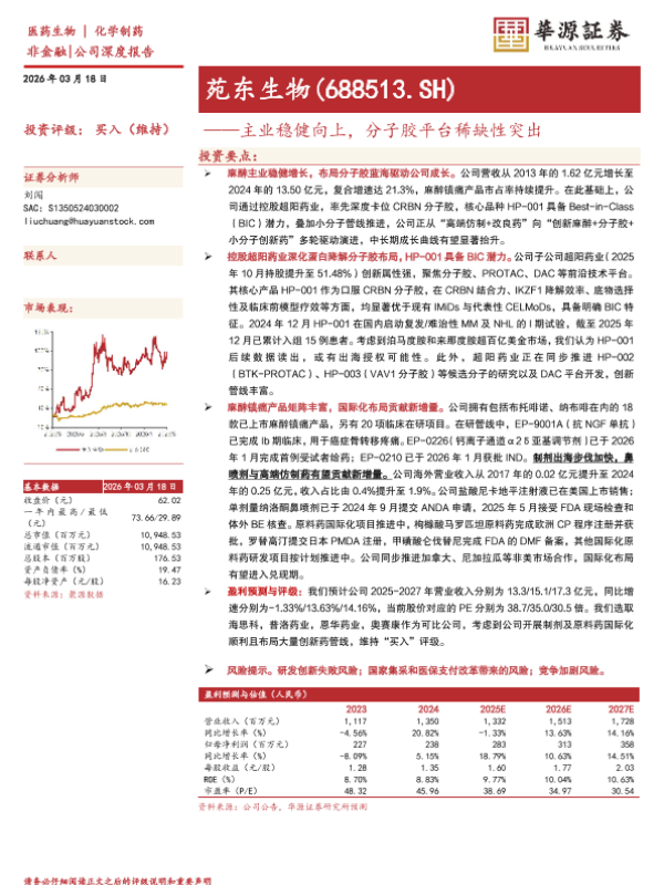 【华源证券】【202603】苑东生物(688513)主业稳健向上,分子胶平台稀缺性突出-26页 证券期货研究报告