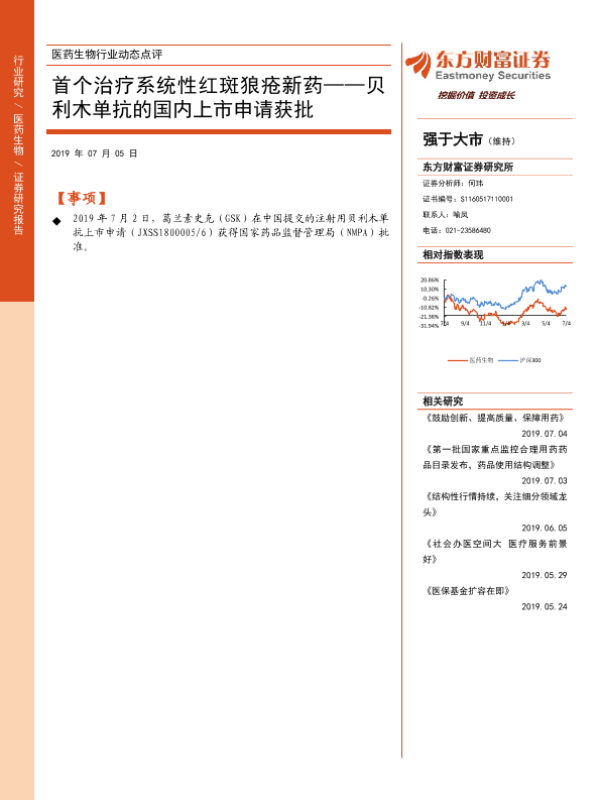 【东方财富证券】【20190705】首个治疗系统性红斑狼疮新药——贝利木单抗的国内上市申请获批-4页 行业研究