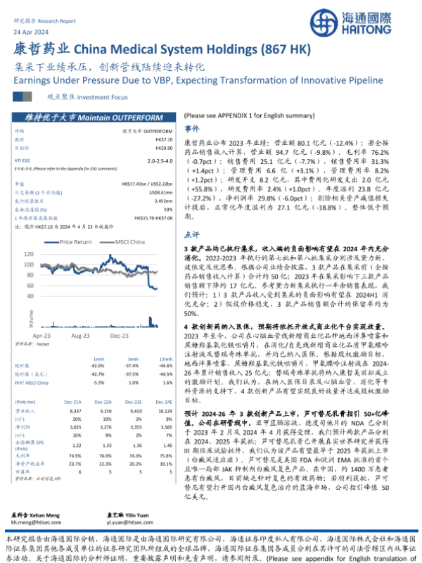 【海通国际】【20240424】康哲药业(00867.HK)集采下业绩承压,创新管线陆续迎来转化-13页 行业研究