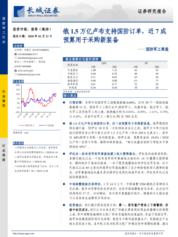 【长城证券】【20200121】20200121-长城证券-国防军工周报:俄1.5万亿卢布支持国防订单,近7成预算用于采购新装备-13页 行业研究
