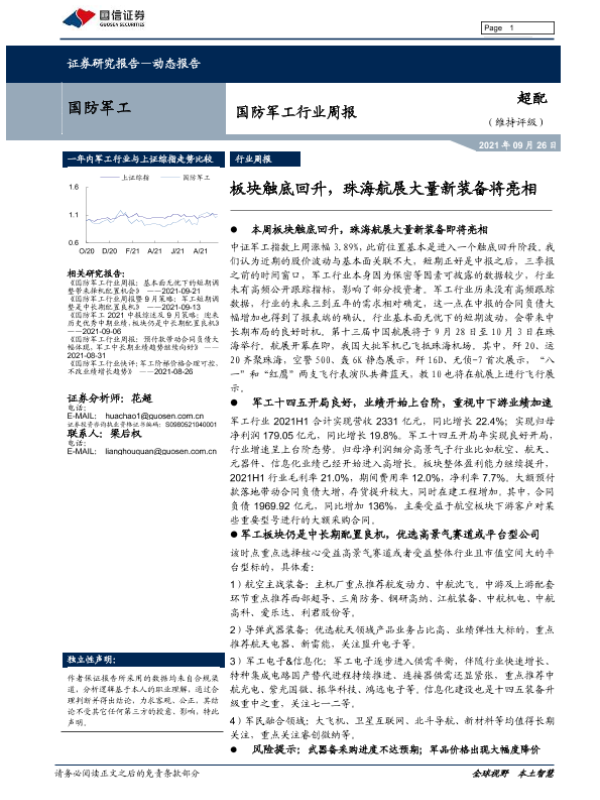 【国信证券】【20210926】国防军工行业周报:板块触底回升,珠海航展大量新装备将亮相-12页 行业研究