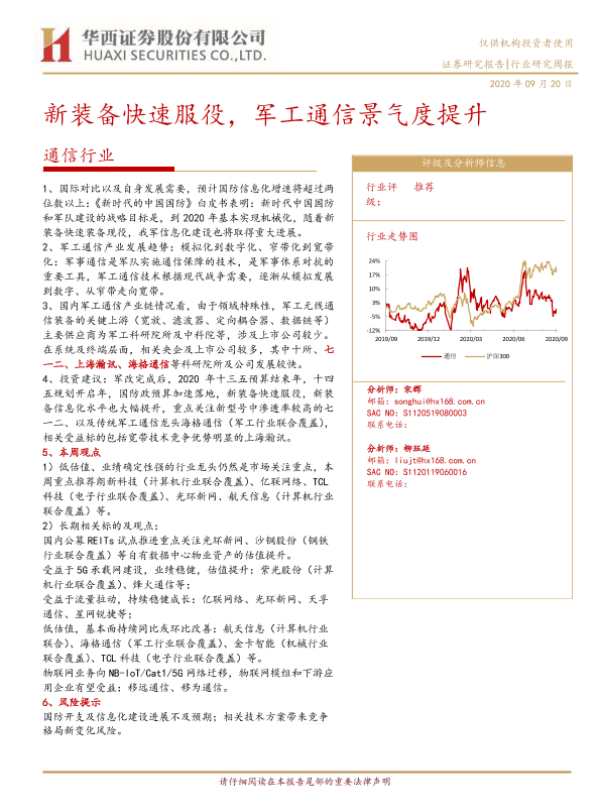 【华西证券】【20200920】通信行业:新装备快速服役,军工通信景气度提升-8页 行业研究