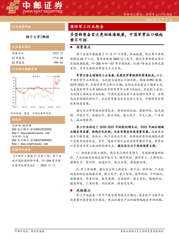 【中邮证券】【20241117】国防军工行业报告:多型新装备首次亮相珠海航展,中国军贸出口崛起势不可挡-22页 行业研究