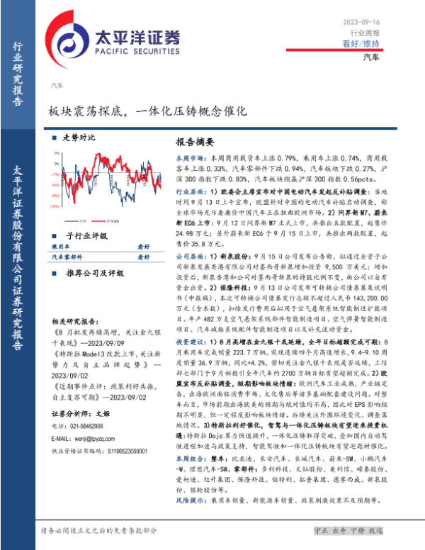 【太平洋证券】【20230916】20230916-太平洋-汽车行业周报:板块震荡探底,一体化压铸概念催化-23页 行业研究