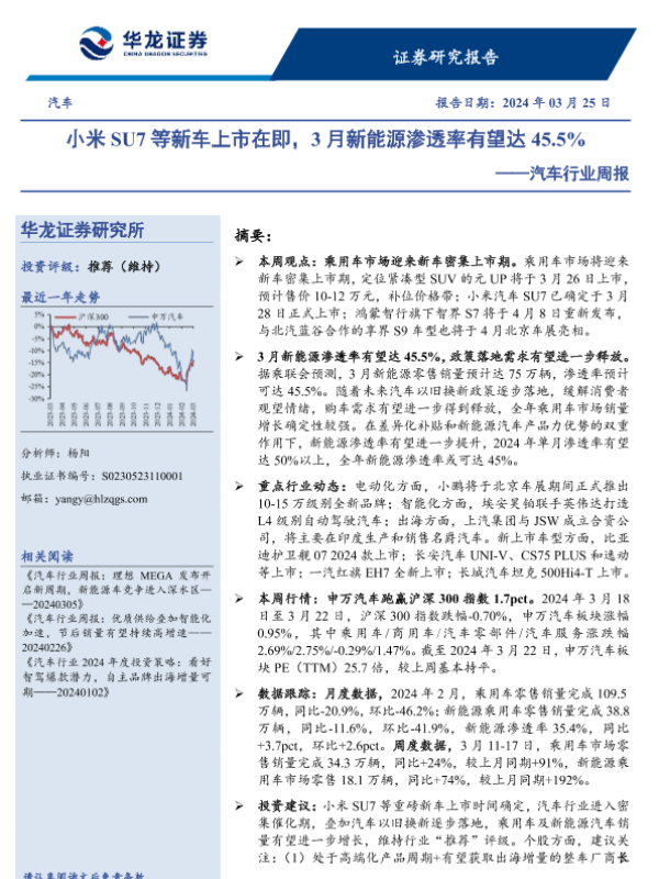【华龙证券】【20240325】小米SU7等新车上市在即,3月新能源渗透率有望达45.5%-18页 行业研究