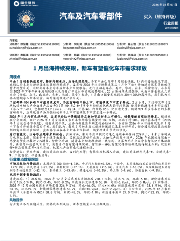 【国金证券】【202602】汽车及汽车零部件行业周报:1月出海持续亮眼,新车有望催化车市需求释放-12页 证券期货研究报告