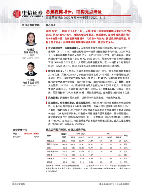 【中信证券】【20201112】商业零售行业2020年双十一专题:总量稳健增长,结构亮点纷呈-12页 行业研究
