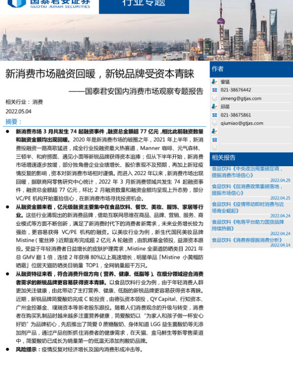 【国泰君安证券】【20220504】新消费市场融资回暖,新锐品牌受资本青睐-2页 行业研究