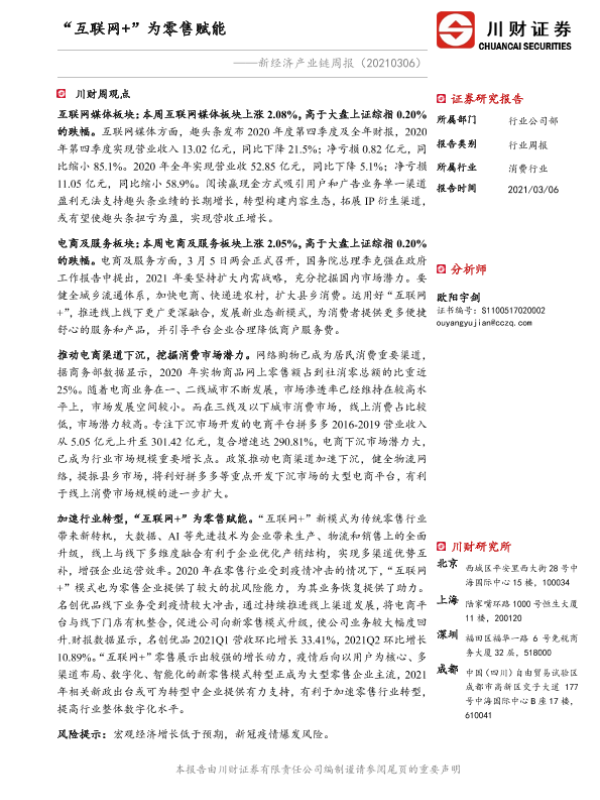 【川财证券】【20210306】新经济产业链周报:“互联网+”为零售赋能-12页 行业研究