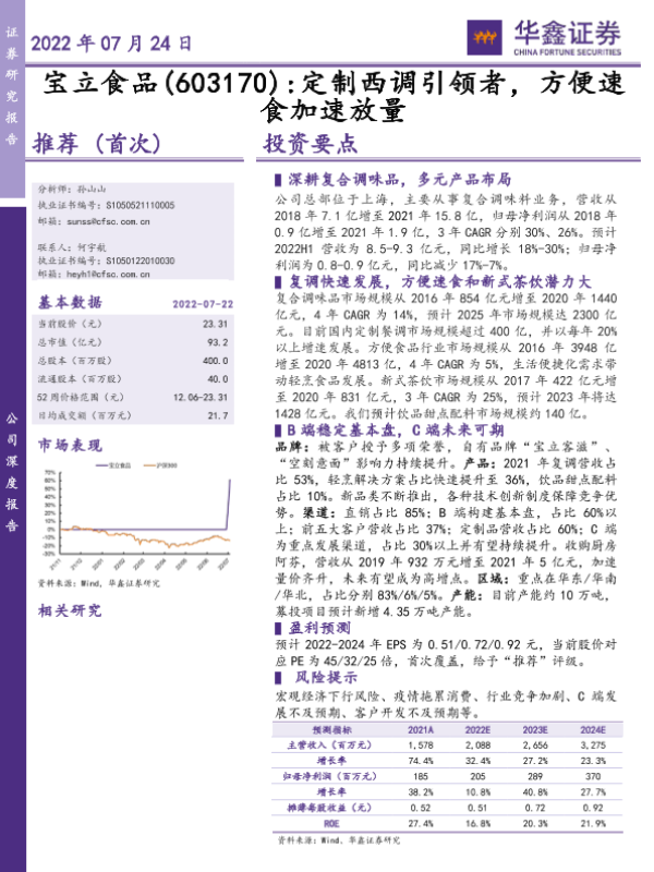 【华鑫证券】【20220724】宝立食品(603170) 定制西调引领者,方便速食加速放量-39页 行业研究