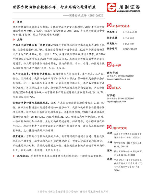 【川财证券】【20210622】消费行业点评:世界方便面协会数据公布,行业高端化趋势明显-2页 行业研究