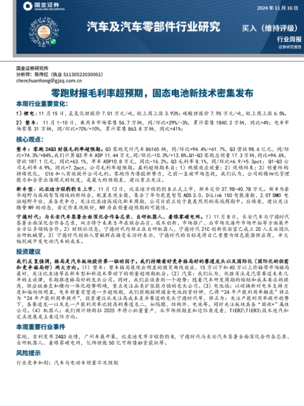 【国金证券】【20241116】汽车及汽车零部件行业研究:零跑财报毛利率超预期,固态电池新技术密集发布-12页 行业研究