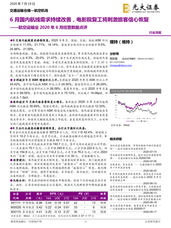 【光大证券】【20200719】6月国内航线需求持续改善,电影院复工将刺激旅客信心恢复-5页 行业研究