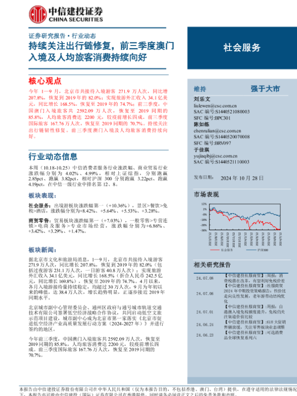 【中信建投证券】【20241028】社会服务行业:持续关注出行链修复,前三季度澳门入境及人均旅客消费持续向好-28页 行业研究