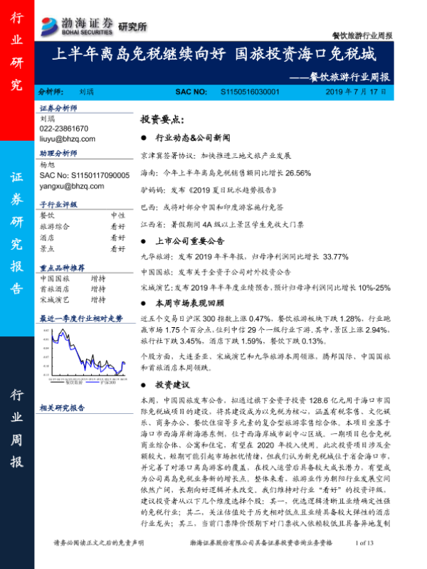 【渤海证券】【20190717】餐饮旅游行业周报:上半年离岛免税继续向好 国旅投资海口免税城-13页 行业研究