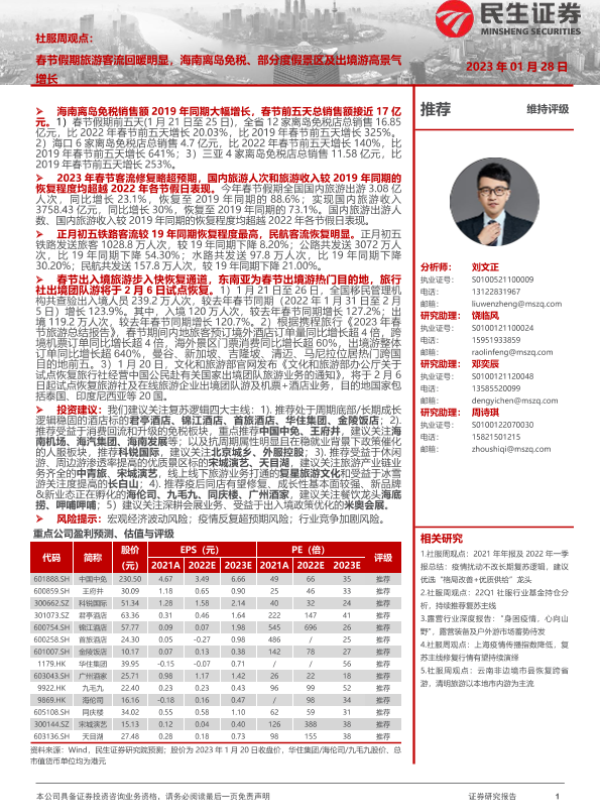 【民生证券】【20230128】社服周观点:春节假期旅游客流回暖明显,海南离岛免税、部分度假景区及出境游高景气增长-24页 行业研究
