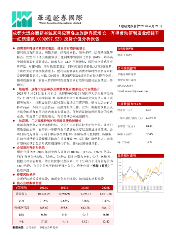【华通证券国际】【20230421】红旗连锁(002697.SZ)投资价值分析报告:成都大运会商超类独家供应商叠加旅游客流增长,有望带动便利店业绩提升-21页 行业研究