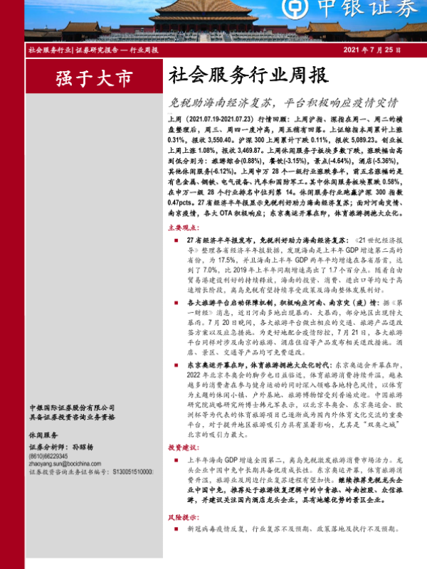 【中银证券】【20210725】社会服务行业周报:免税助海南经济复苏,平台积极响应疫情灾情-18页 行业研究