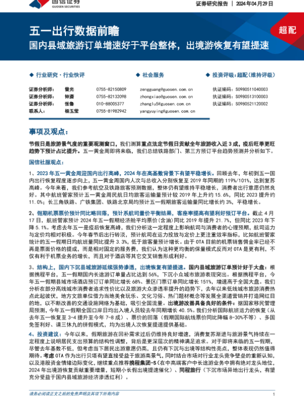 【国信证券】【20240429】五一出行数据前瞻:国内县域旅游订单增速好于平台整体,出境游恢复有望提速-4页 行业研究