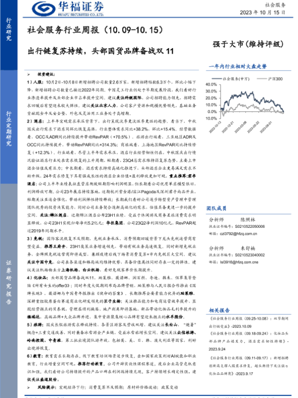【华福证券】【20231015】社会服务行业周报:出行链复苏持续,头部国货品牌备战双11-26页 行业研究