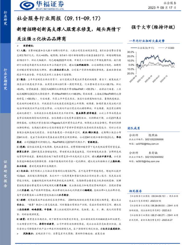 【华福证券】【20230917】社会服务行业周报:新增招聘创新高支撑人服需求修复,超头舆情下关注强α化妆品品牌商-30页 行业研究