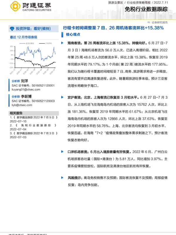 【财通证券】【20220711】行程卡时间调整至7日,26周机场客流环比+15.38%-11页 行业研究