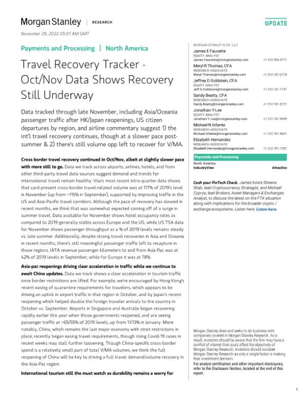 【Morgan Stanley】【20221129】Payments and Processing Travel Recovery Tracker - Oct/Nov Data Shows Recovery Still Underway-16页 行业研究