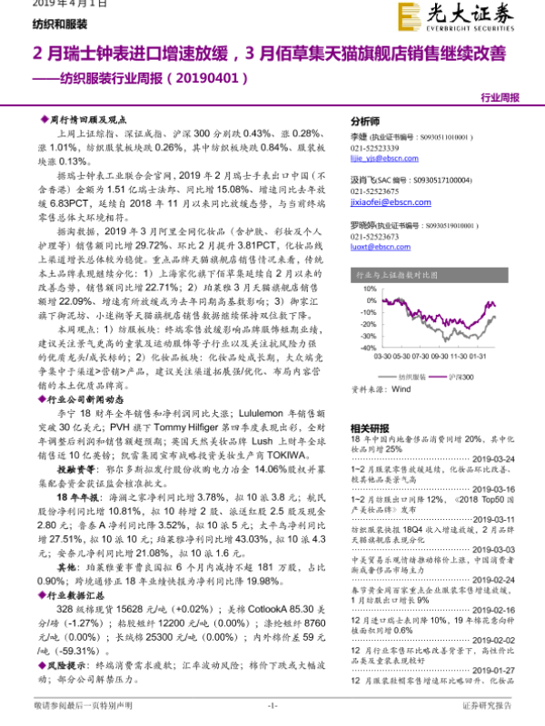 【光大证券】【20190401】20190401-光大证券-纺织服装行业周报:2月瑞士钟表进口增速放缓,3月佰草集天猫旗舰店销售继续改善-18页 行业研究