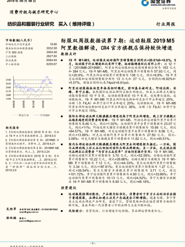 【国金证券】【20190609】纺服双周报数据谈第7期:运动鞋服2019M5阿里数据解读,CR4官方旗舰店保持较快增速-13页 行业研究