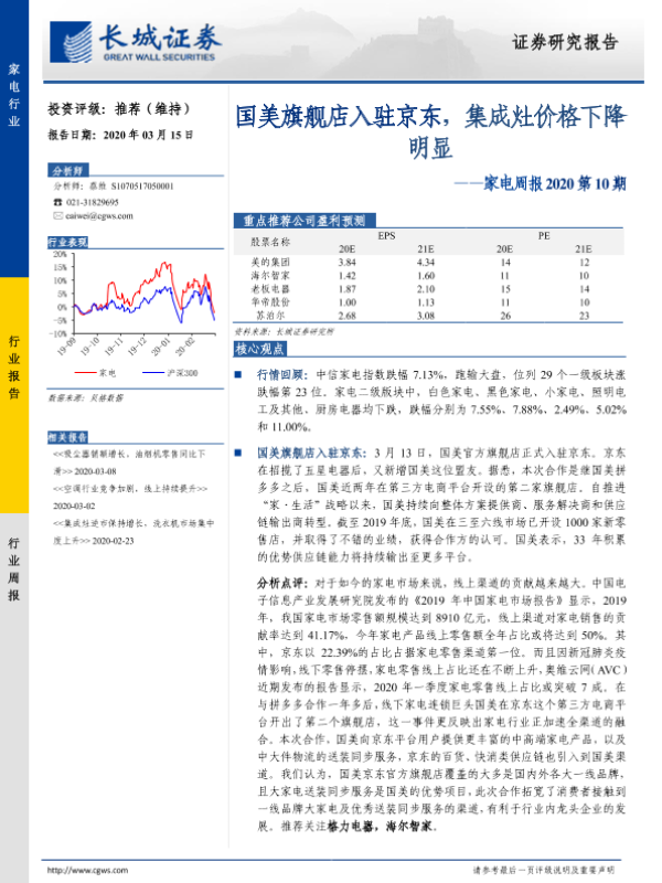 【长城证券】【20200315】家电周报2020第10期:国美旗舰店入驻京东,集成灶价格下降明显-11页 行业研究
