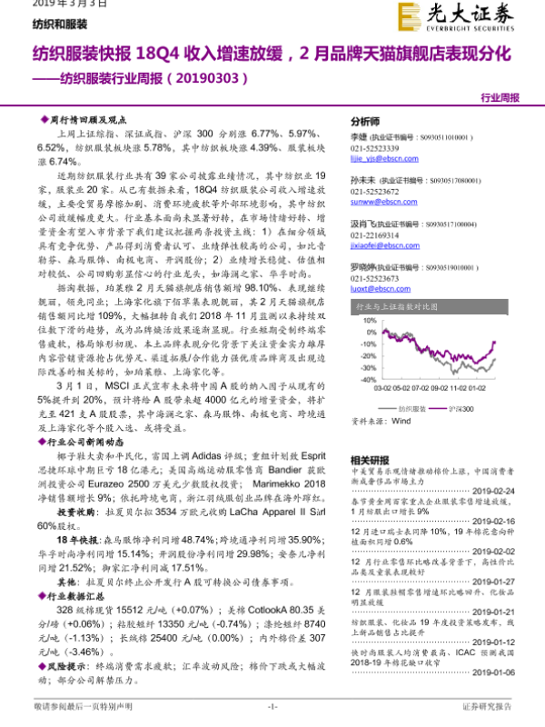 【光大证券】【20190303】纺织服装行业周报:纺织服装快报18Q4收入增速放缓,2月品牌天猫旗舰店表现分化-20页 行业研究