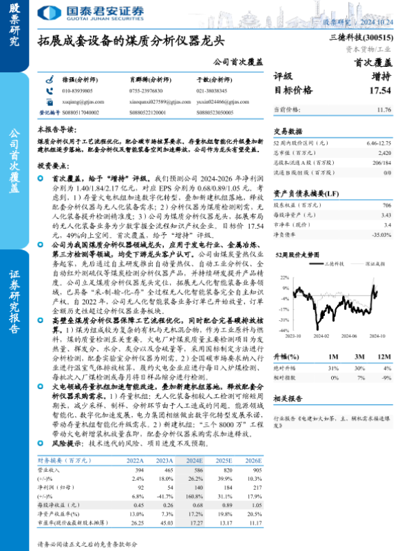 【国泰君安证券】【20241024】三德科技(300515)公司首次覆盖:拓展成套设备的煤质分析仪器龙头-16页 行业研究