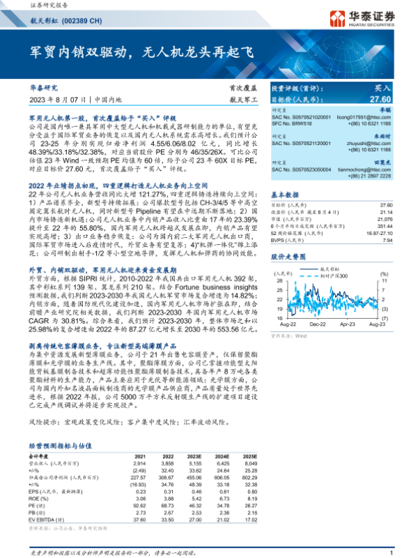 【华泰证券】【20230807】军贸内销双驱动,无人机龙头再起飞-33页 行业研究
