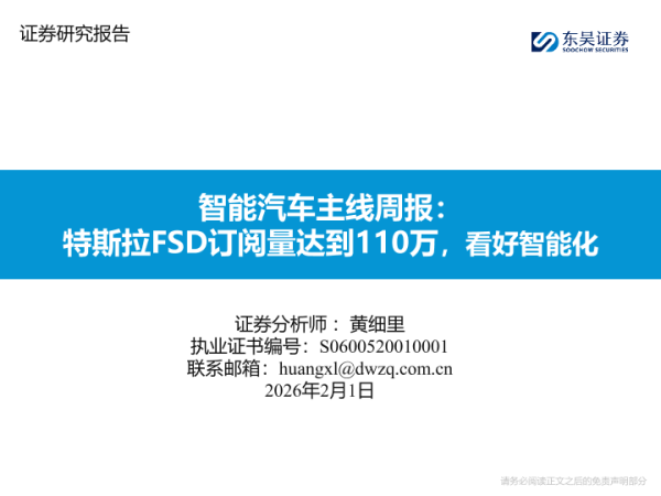 【东吴证券】【202602】智能汽车主线周报:特斯拉FSD订阅量达到110万,看好智能化-15页 证券期货研究报告