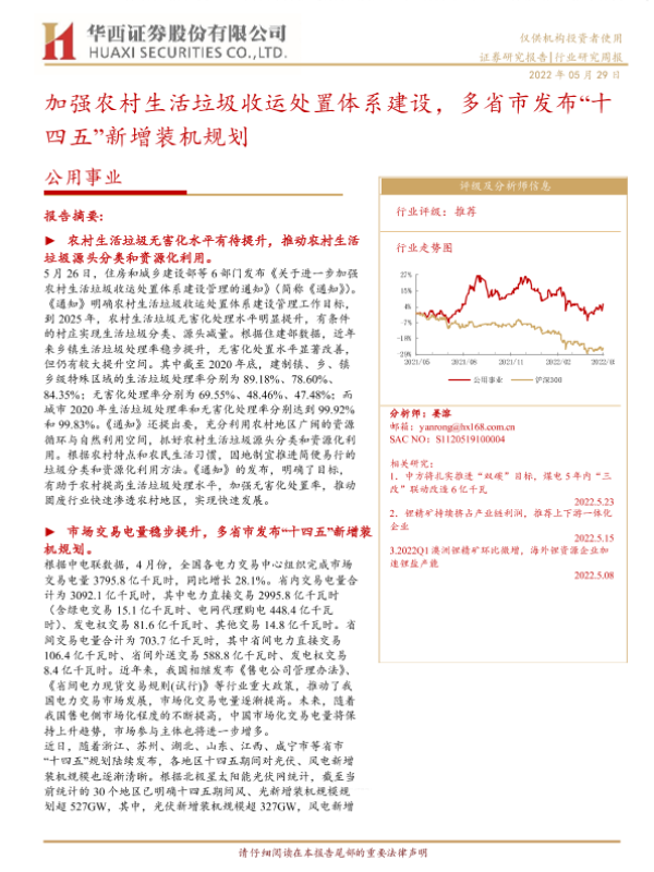 【华西证券】【20220529】加强农村生活垃圾收运处置体系建设,多省市发布“十四五”新增装机规划-22页 行业研究