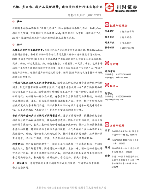 【川财证券】【20210722】消费行业点评:无糖、多口味、新产品成新趋势,建议关注饮料行业头部企业-2页 行业研究