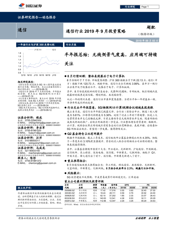 【国信证券】【20190903】通信行业2019年9月投资策略:半年报总结:无线侧景气度高,应用端可持续关注-13页 行业研究