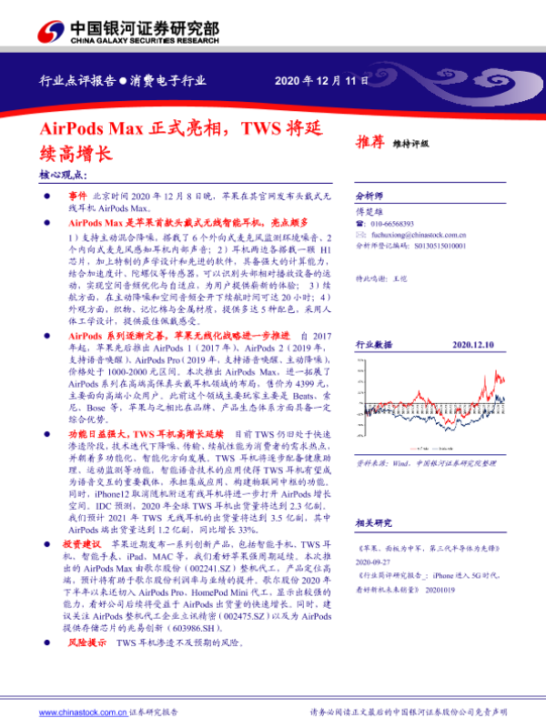 【银河证券】【20201211】消费电子行业:AirPods Max正式亮相,TWS将延续高增长-2页 行业研究