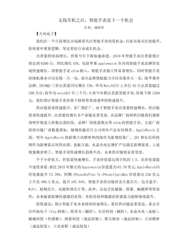 【天风证券】【20191218】无线耳机之后,智能手表是下一个机会-1页 行业研究
