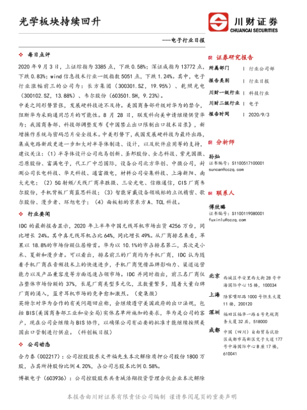 【川财证券】【20200903】电子行业日报:光学板块持续回升-5页 证券期货研究报告