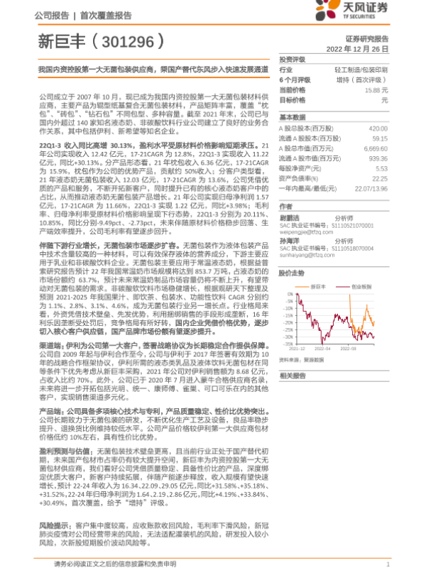 【国盛证券】【20230117】新巨丰(301296.SZ)无菌包装龙头,国产替代进行时-29页 行业研究