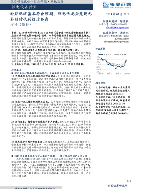 【东吴证券】【20190326】锂电设备行业:补贴退坡基本符合预期,锂电池龙头竞逐无补贴时代利好设备商-6页 行业研究