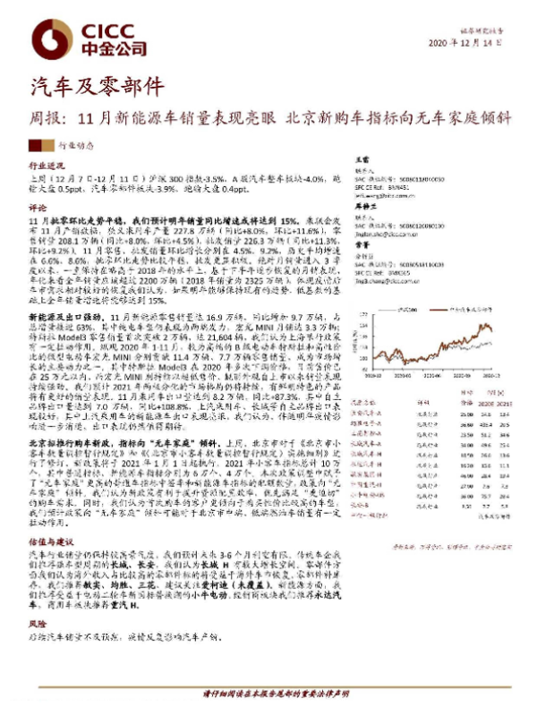 【中金公司】【20201214】汽车及零部件周报:11月新能源车销量表现亮眼,北京新购车指标向无车家庭倾斜-12页 行业研究