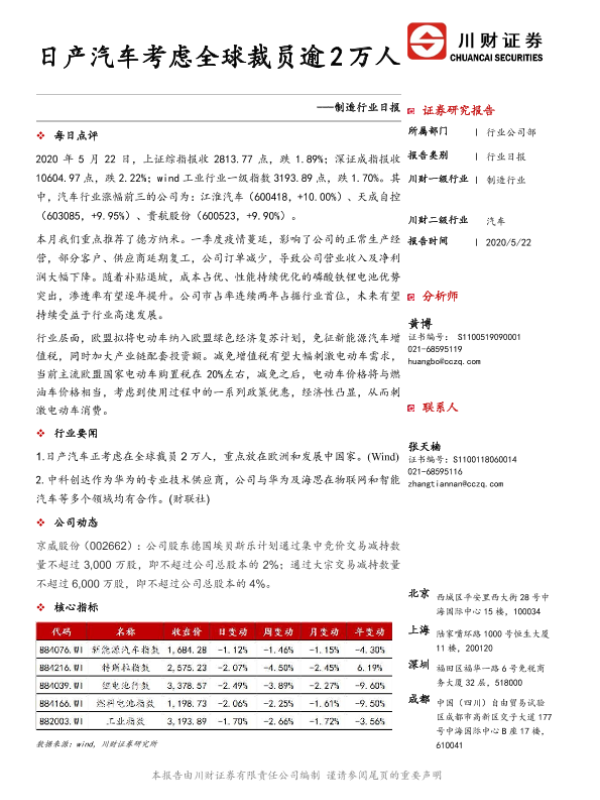 【川财证券】【20200522】制造行业日报:日产汽车考虑全球裁员逾2万人-3页 行业研究