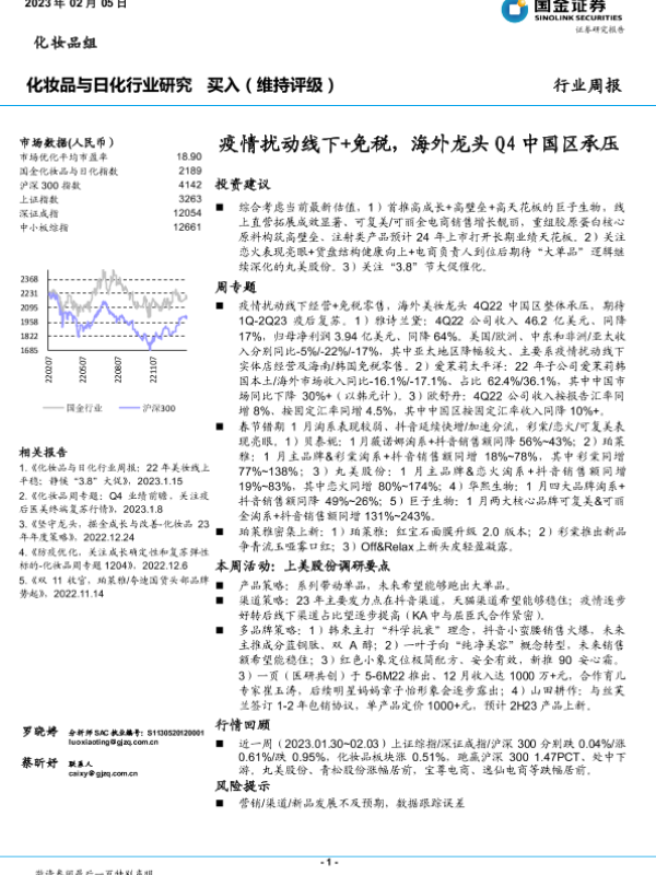 【国金证券】【20230205】化妆品与日化行业研究:疫情扰动线下+免税,海外龙头Q4中国区承压-13页 行业研究