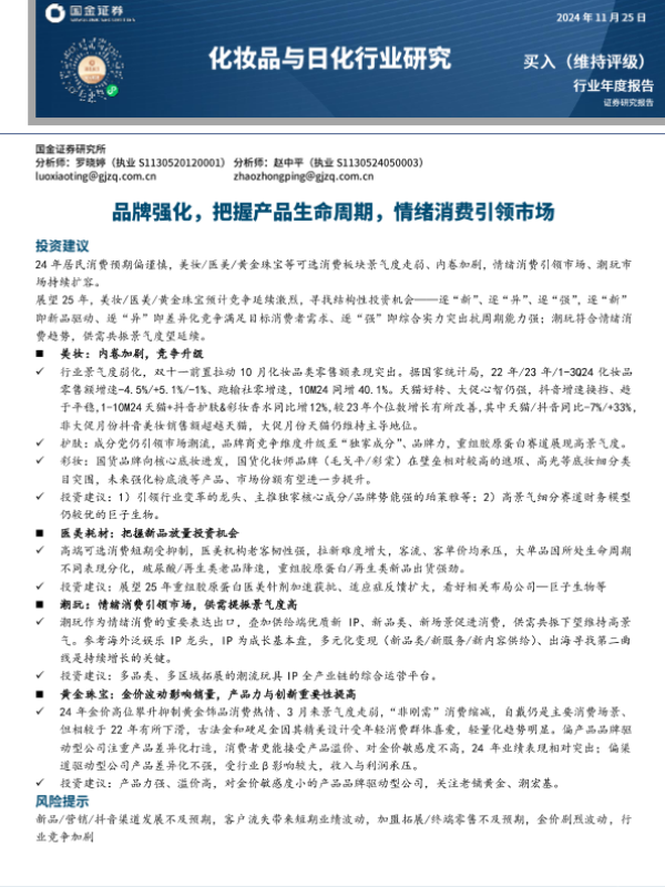 【国金证券】【20241125】化妆品与日化行业研究:品牌强化,把握产品生命周期,情绪消费引领市场-22页 行业研究