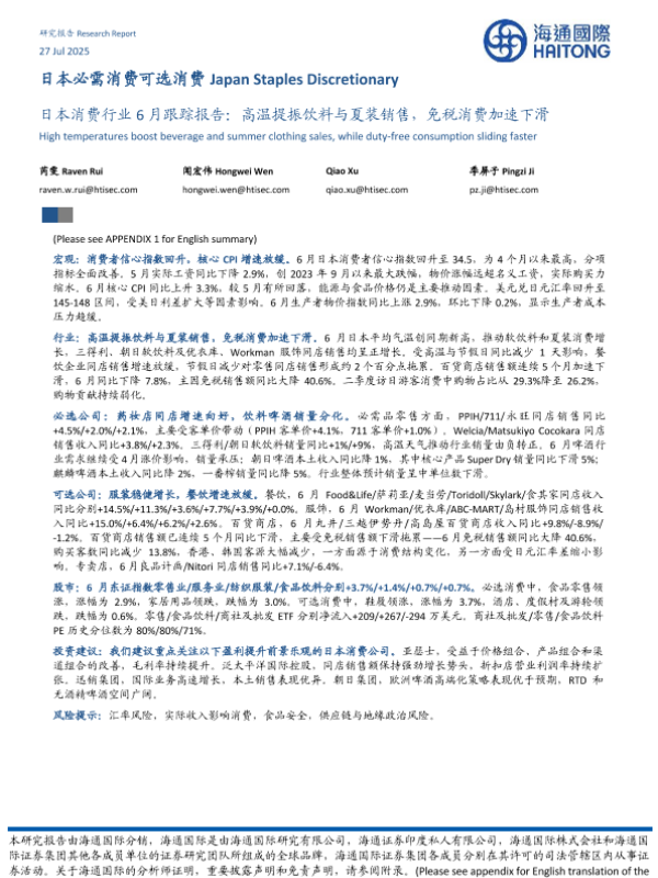 【海通国际】【202507】日本消费行业6月跟踪报告:高温提振饮料与夏装销售,免税消费加速下滑-24页 行业研究