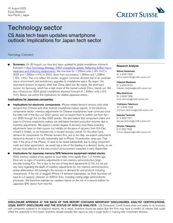 【Credit Suisse】【20220831】Technology sector-9页 行业研究